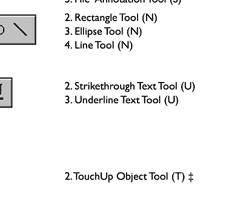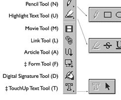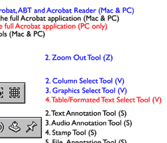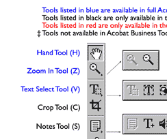 Below is the toolbox for Acrobat 4.x (Win & Mac) and Acrobat Reader 4.x (Win & Mac). The shortcut key is listed next to each entry. Download the PDF version to view offline and print (PDF 440kb). To save it right click (for Mac hold down Control) and choose to Save. The toolbox covers the these versions of Acrobat: