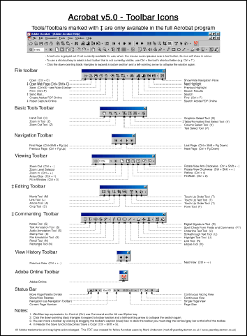 Below is a thumbnail of a PDF which shows all the toolbars in Acrobat v5.x and Acrobat Reader 4.x. The shortcut key is listed next to each entry. Download the PDF version to view offline and print (PDF 136kb). To save it right click (for Mac hold down Control) and choose to Save. The PDF covers the these versions of Acrobat: